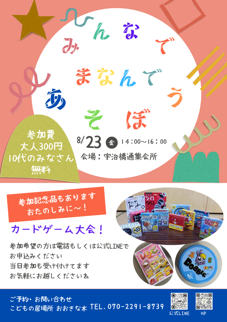 2024年8月23日14:00-16:00 こどもの居場所 おおきな木では、「カードゲーム大会」を開催します😃