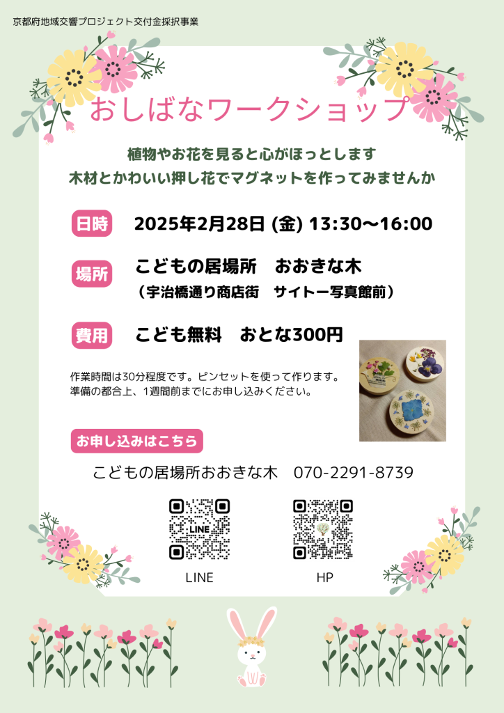 2025-02-26 Home › お知らせ › 「押し花ワークショップ」開催のお知らせ 「押し花ワークショップ」開催のお知らせ 2月28日(金)、押し花で小物づくりをします。所要時間は30分程度です。参加をご希望の方は1週間前までにお申し込みください。 関連記事 「クリスマス会」開催のお知らせ 「ユース・コミュニティづくり応援業務」受託のお知らせ 「おしごと見学会」開催のお知らせ 新しい居場所「小さなとまり木」がスタートします! 令和8年度 開設日時の変更について 「クリスマス会」開催のお知らせ 「ユース・コミュニティづくり応援業務」受託のお知らせ コメントを書くにはログインが必要です コメントを残す コメントをキャンセルコメントを投稿するにはログインしてください。